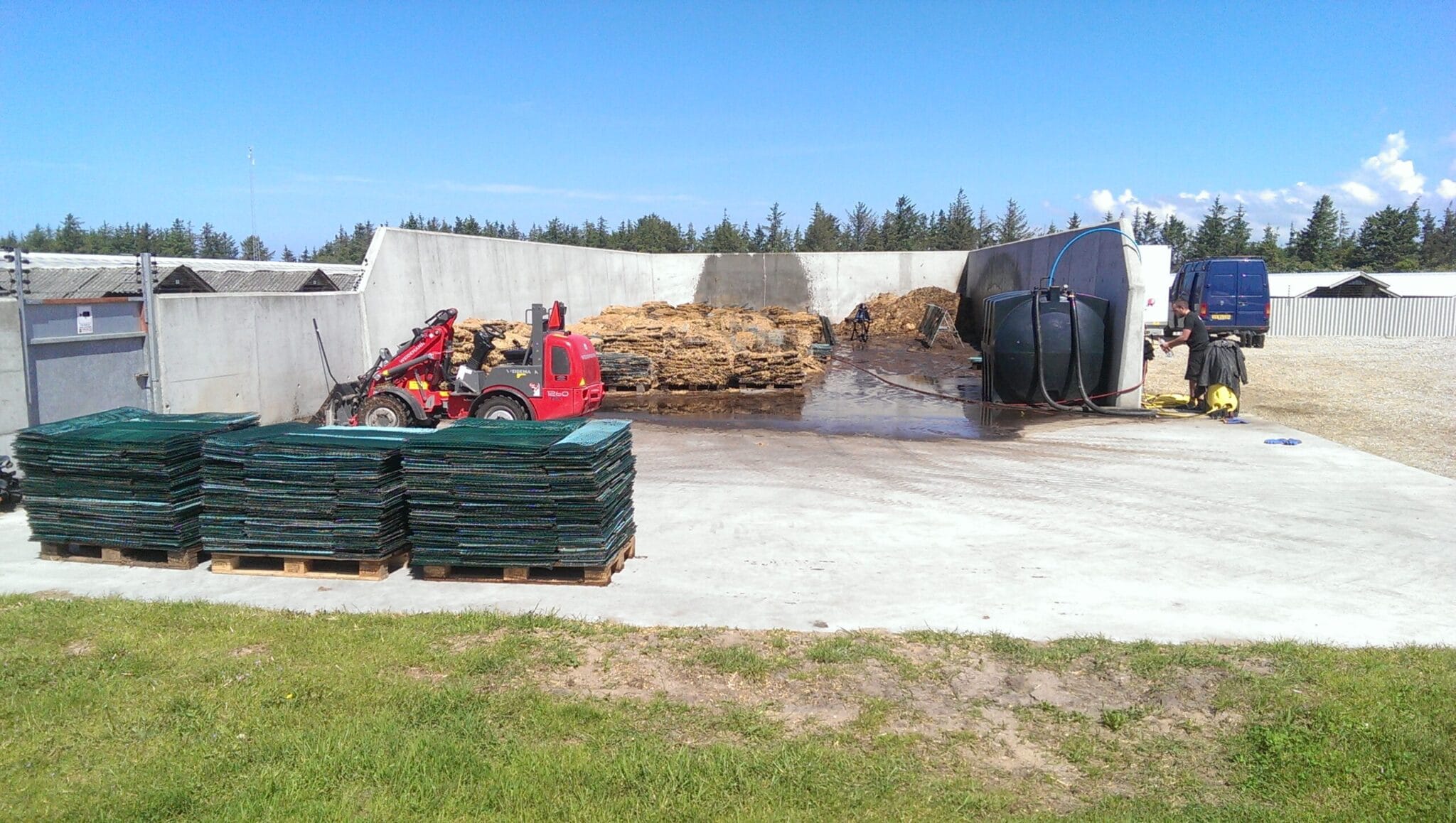 Omtrent 24 timer før vores ankomst sættes en vandspreder op, så hvalpenettene er gennemblødte inden rensningen.
